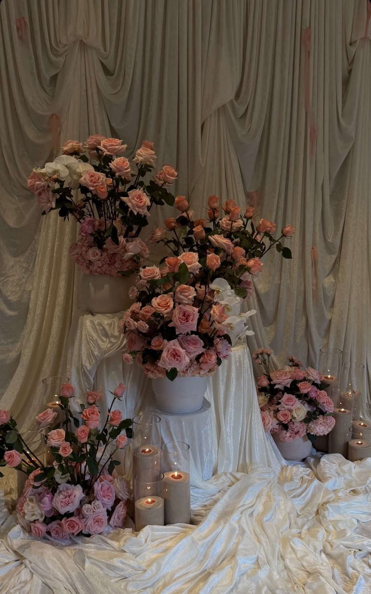 Veliki aranžmani ružičastih ruža, pažljivo raspoređeni po prostoru, u kombinaciji s bijelim draperijama i svijećama stvorili su toplu atmosferu.
