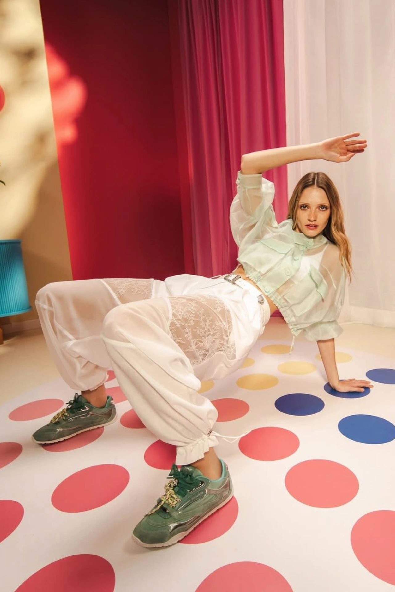 Umjesto klasičnih formi, nova kampanja donosi viziju urbane buntovnice koja s nevjerojatnom lakoćom spaja luksuznu romantiku i opušteni streetwear. Najbolji primjer su lepršave, poluprozirne bijele hlače obogaćene delikatnom čipkom, koje u kombinaciji s robusnim, modernim Pinko tenisicama metalik odsjaja stvaraju savršen balans između nježnog i sirovog.