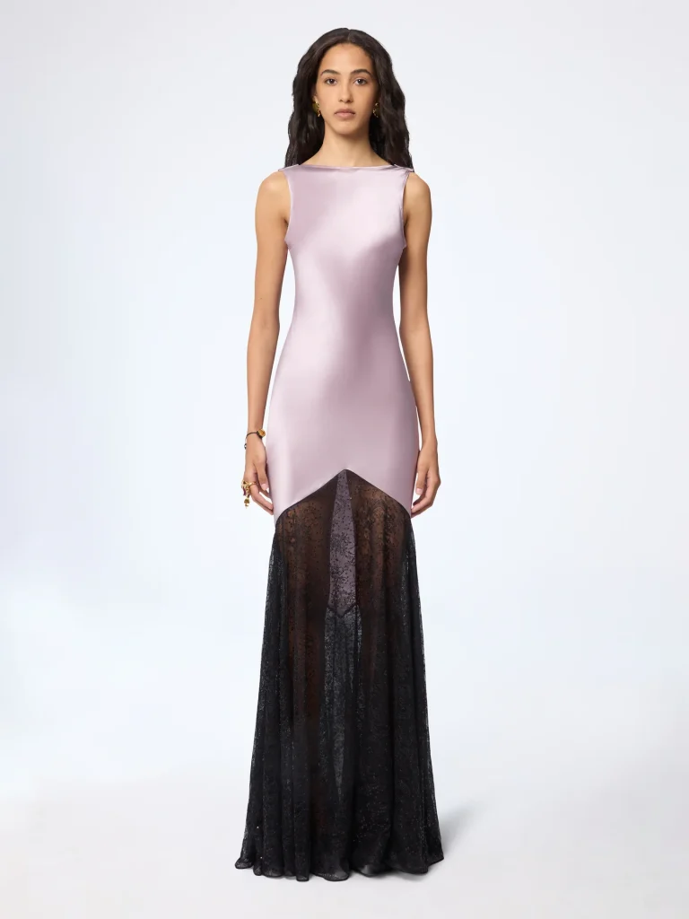 S druge strane, za ljubiteljice profinjene, ali pomalo drske elegancije, tu je haljina s istim francuskim potpisom koja doslovno ostavlja bez daha. Nježni, svilenkasti sjaj gornjeg dijela u pastelnoj lila nijansi besprijekorno prati liniju tijela, a zatim se u odvažnom rezu pretvara u dramatičnu, prozirnu crnu čipku koja pada sve do poda. U ovim kreacijama izgledat ćete maksimalno dotjerano, iznimno elegantno i nevjerojatno glamurozno, spremni ukrasti baš svaki pogled u prostoriji.