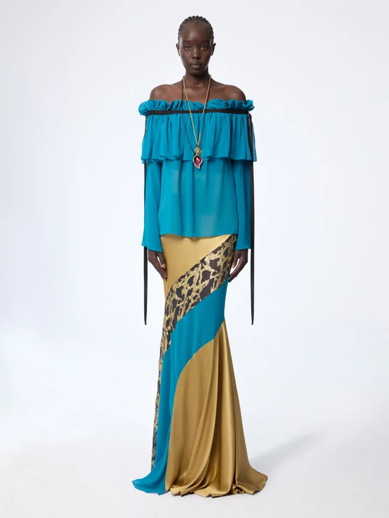 Bilo da je riječ o spoju raskošne suknje i upečatljivog gornjeg dijela ili pak senzualnoj haljini, Nina Ricci rješava vas svakog stresa oko kombiniranja. Samo pogledajte ovu fantastičnu igru boja i uzoraka: lepršavi tirkizno plavi top sa zavodljivo spuštenim ramenima i romantičnim volanima savršeno se stapa s maksi suknjom u kojoj se asimetrično isprepliću luksuzna zlatno-žuta nijansa, plavi paneli i odvažni leopard print.