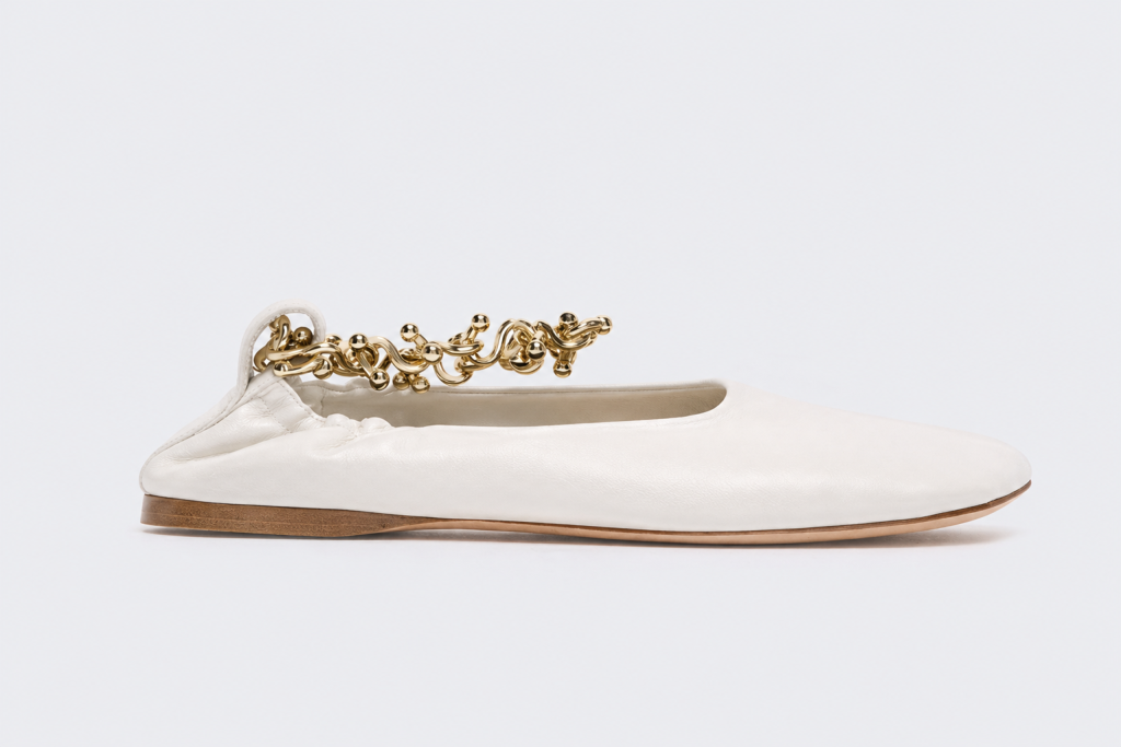 Sva romantika, volumen i ženstvenost haljine genijalno su ‘spuštene na zemlju’ potpuno neočekivanim izborom obuće. Riječ je o bijelim ravnim cipelama, također s potpisom Sportmaxa, koje su apsolutna suprotnost onome što biste na prvu očekivali uz ovakav kroj. Njihov oštar, pomalo strog vrh i upečatljiv detalj masivnog lanca oko gležnja daju cijelom ‘looku’ dozu modernog stava.