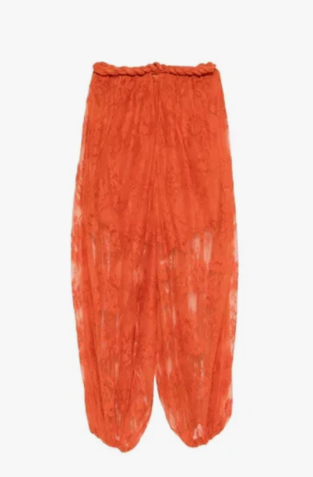 Riječ je o modelu bez naramenica, koji se ističe zanimljivim, pletenim detaljem na samom rubu dekoltea te suptilnim prorezom koji daje dozu seksepila bez prelaska granice dobrog ukusa. Ono što ovaj kombinezon čini pravim remek-djelom jest polukružni, prozračni kroj hlača koji podsjeća na dimije. Ispod raskošne narančaste čipke s cvjetnim motivima nazirala se kraća podstava, što je stvorilo predivnu igru tekstura i otkrilo siluetu nogu na vrlo elegantan način.