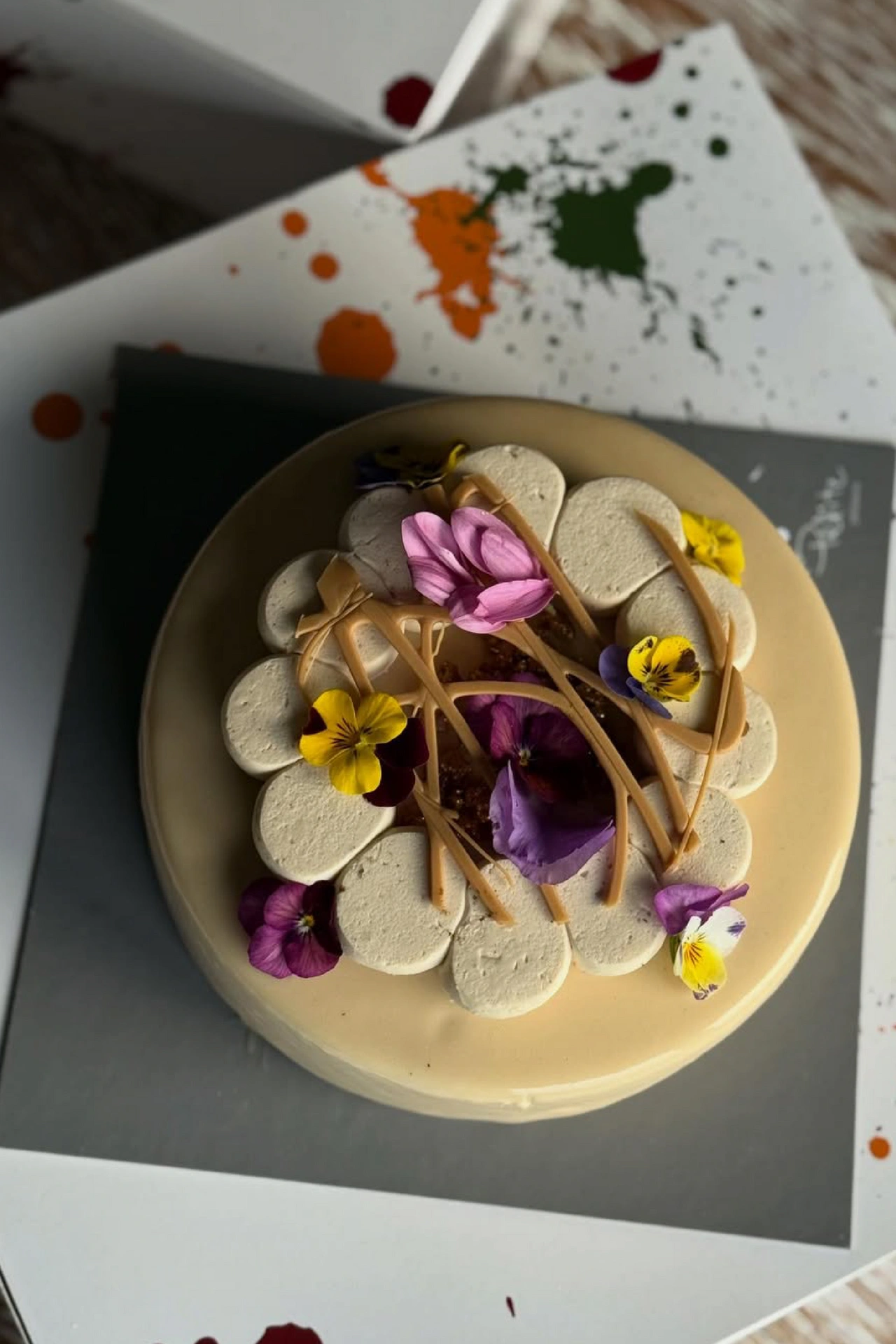 Nakon obilnog uskršnjeg doručka i ručka, tradicionalni kolači često znaju biti preteški, stoga je ovakav tip moderne slastice savršeno osvježenje. Ova torta na prvu osvaja svojim profinjenim, gotovo umjetničkim izgledom koji će dominirati svakim stolom. Prekrivena je nježnom, glatkom svijetlom kremom i ukrašena elementima koji podsjećaju na latice cvijeta. Cijela je vizualna priča dodatno ‘podignuta’ razigranim nitima karamele i predivnim, realističnim proljetnim cvijećem u žutim i ljubičastim tonovima. Toliko je estetski privlačna da komotno može poslužiti kao glavni ukras vašeg blagdanskog stola, a fotografije za društvene mreže prije samog rezanja su zagarantirane!